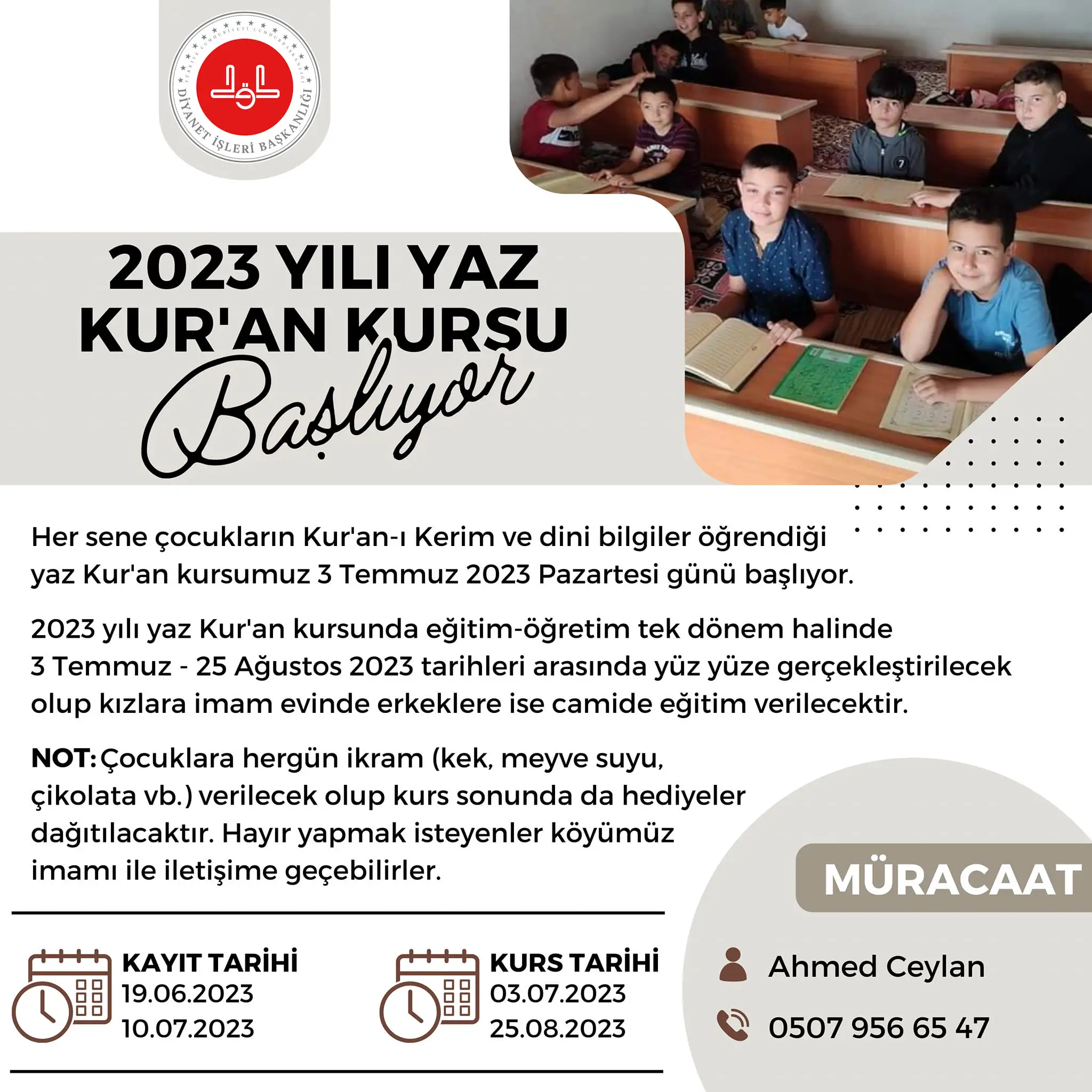 NOT: Çocuklara hergün ikram (kek, meyve suyu, çikolata vb.) verilecek olup kurs sonunda da hediyeler dağıtılacaktır. Hayır yapmak isteyenler köyümüz imamı ile iletişime geçebilirler.