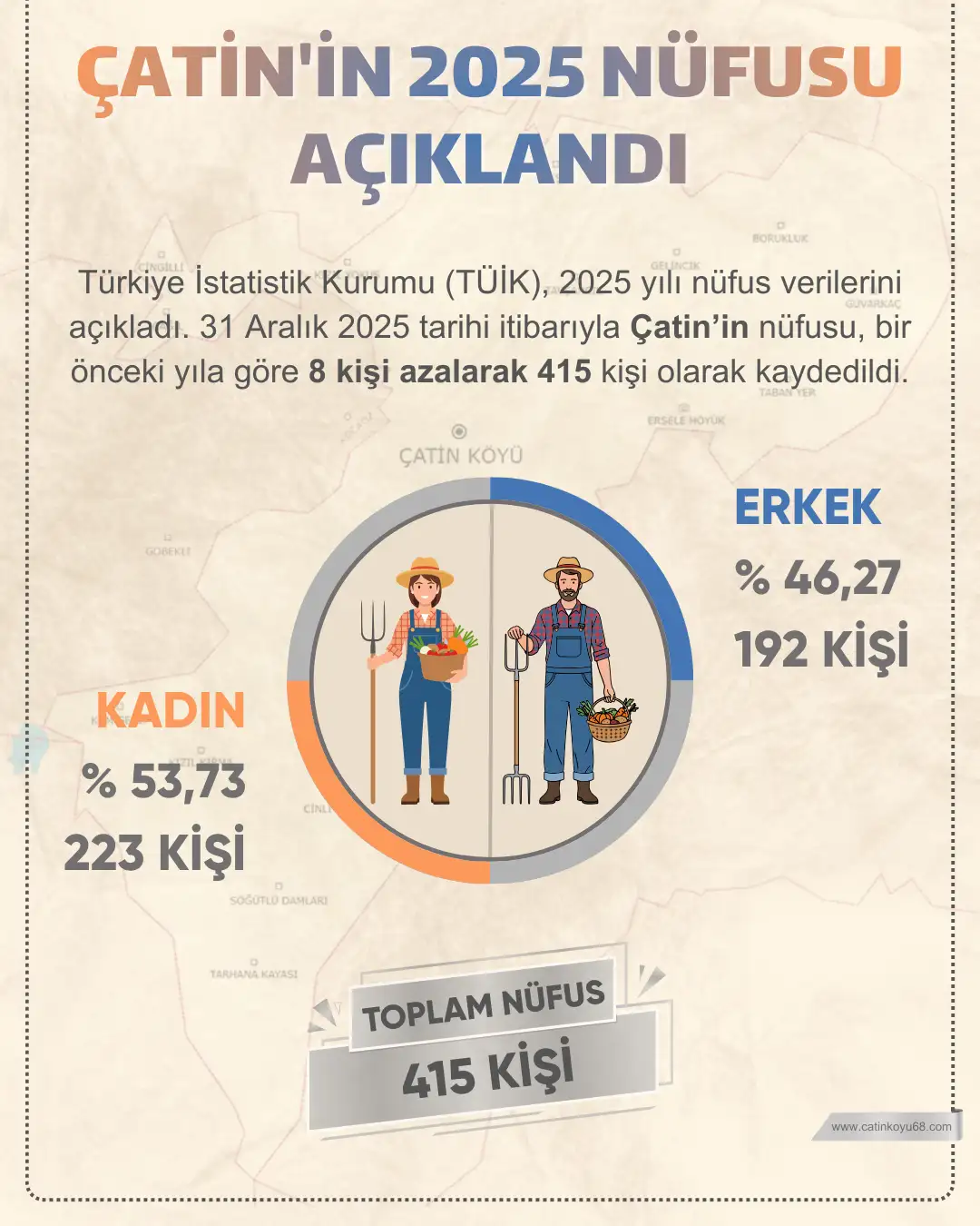 Türkiye İstatistik Kurumu (TÜİK) tarafından açıklanan Adrese Dayalı Nüfus Kayıt Sistemi (ADNKS) 2025 yılı sonuçlarına göre, Çatin’in nüfusu 31 Aralık 2025 itibarıyla bir önceki yıla göre 8 kişi azalarak 415 kişi olarak kaydedildi.